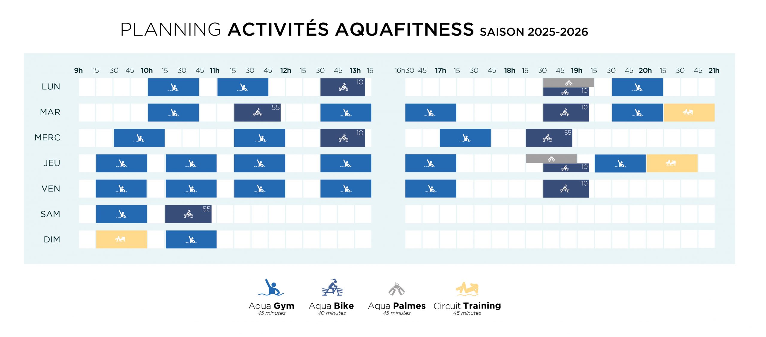 PLANNING ACTIVITÉS ACTIVITÉS ADULTES APPRENTISSAGE AQUA PALMES PERFECTIONNEMENT AQUAGYM AQUABIKE CIRCUIT TRAINING ACTIVITÉS ENFANTS BB & Cie JARDIN AQUATIQUE ACADÉMIE DES KIDS CAP ROUGE CAP BLANC CAP BLEU